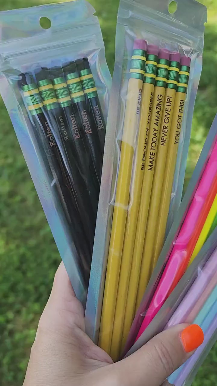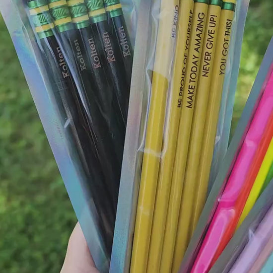 Each set includes 5 pre-sharpened pencils laser engraved with the name or affirmation of your choice. Multiple colors available.
